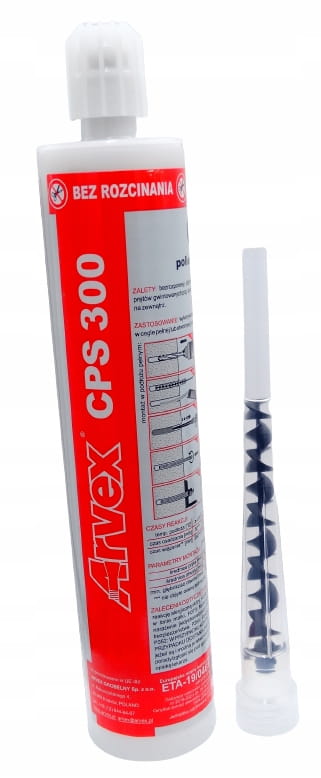В трубе используется безводный, быстросвязывающий высокопрочный гибридный раствор (виниловая сложная смола и цемент) для использования в бетоне и кладке. Смола и цемент, вода и отвердитель находятся в отдельных цилиндрах, смешивание происходит в смесителе только в момент экструзии из упаковки. Упаковка может быть повторно использована после замены смесителя. Подходит для крепления арматурных стержней. Система впрыска для закрепления бетона, твердых блоков, пустотелого бетона и газобетона. Высокопрочный гибридный раствор для самых высоких нагрузок во всех материалах. Универсальный инъекционный раствор (летняя версия) без стирола, для склеивания помощь со стандартными силиконовыми экструзионными пушками