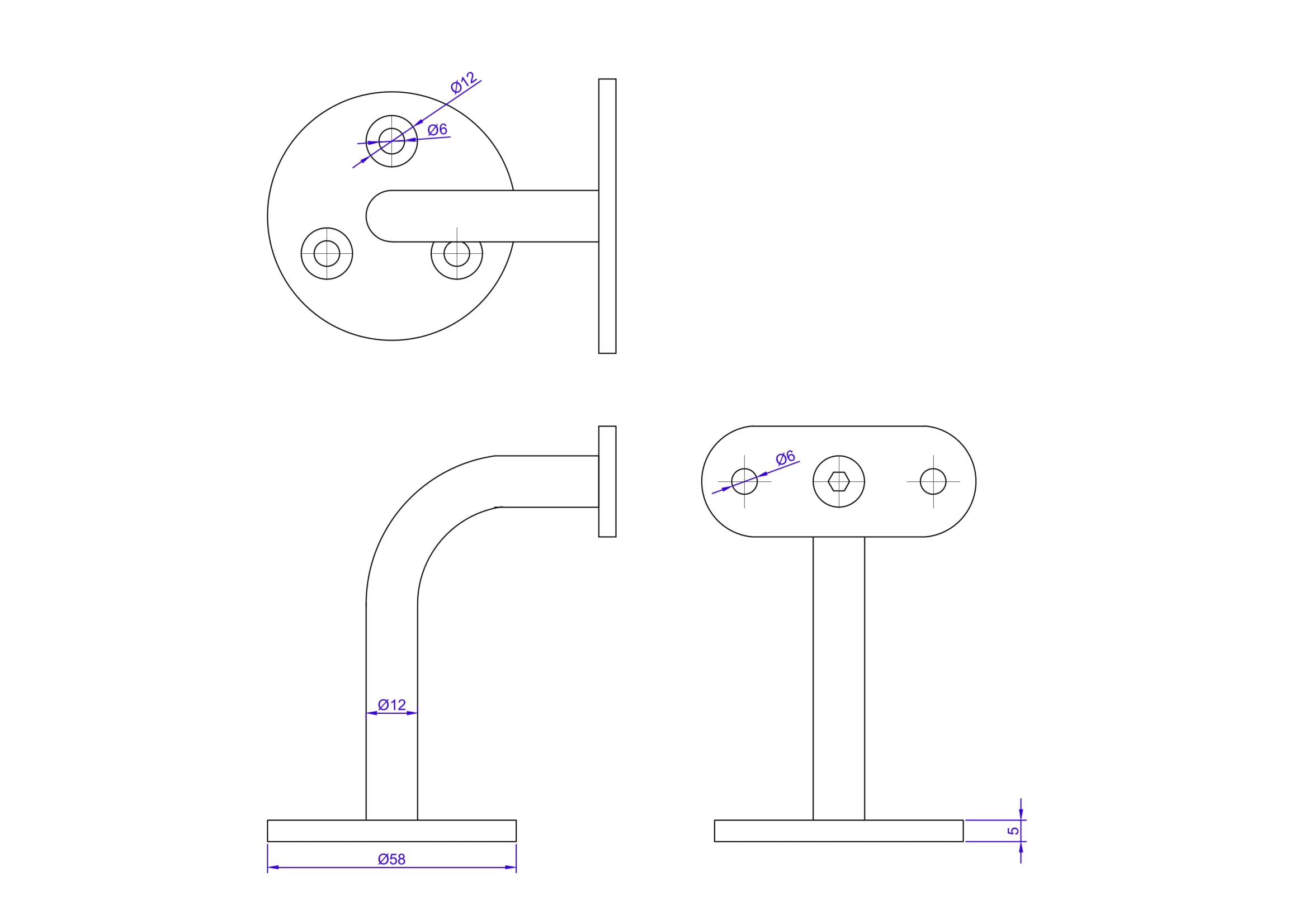 Крепления пoручня (WB.010.01.04.S 12) устанавливаются в 25 см от концов для длины 175 см и 15 см от концов для длины 100 – 150 см