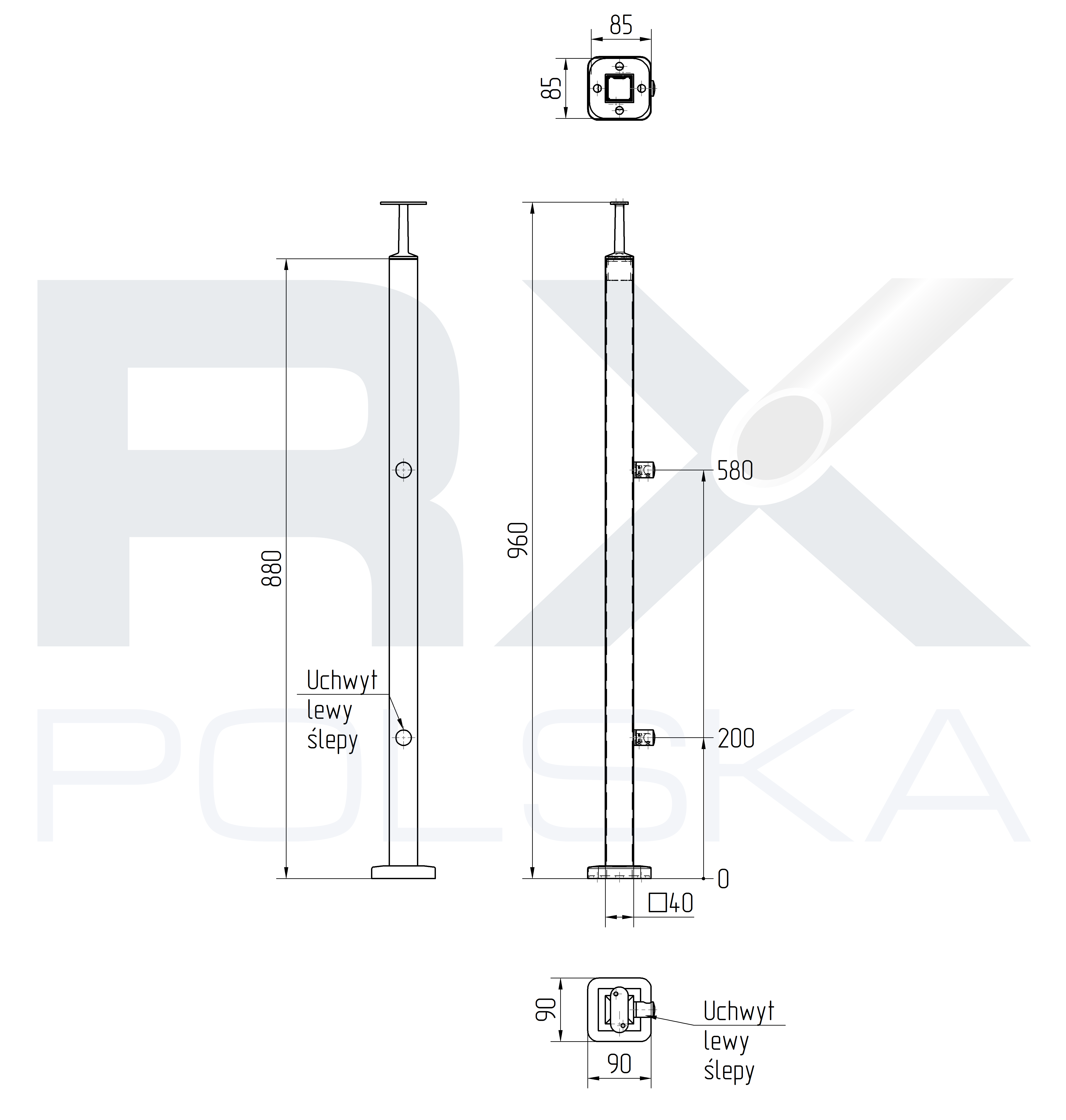 Столбик ЛЕВЫЙ 40x40мм с 2 ригелями на трубу 12мм, AISI 304, ШЛИФ