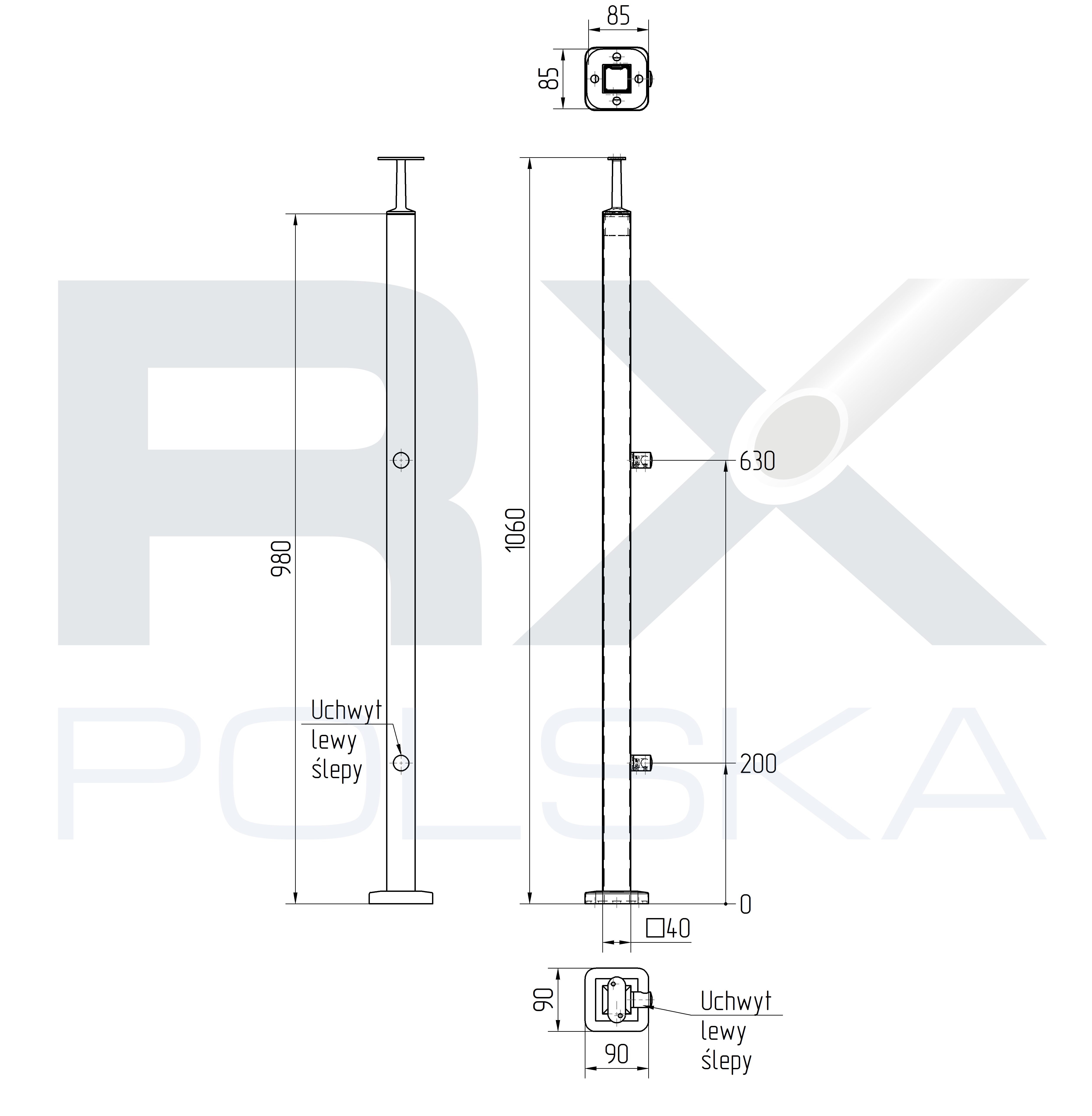 Столбик ЛЕВЫЙ 40x40мм с 2 ригелями на трубу 16мм, AISI 304, ШЛИФ