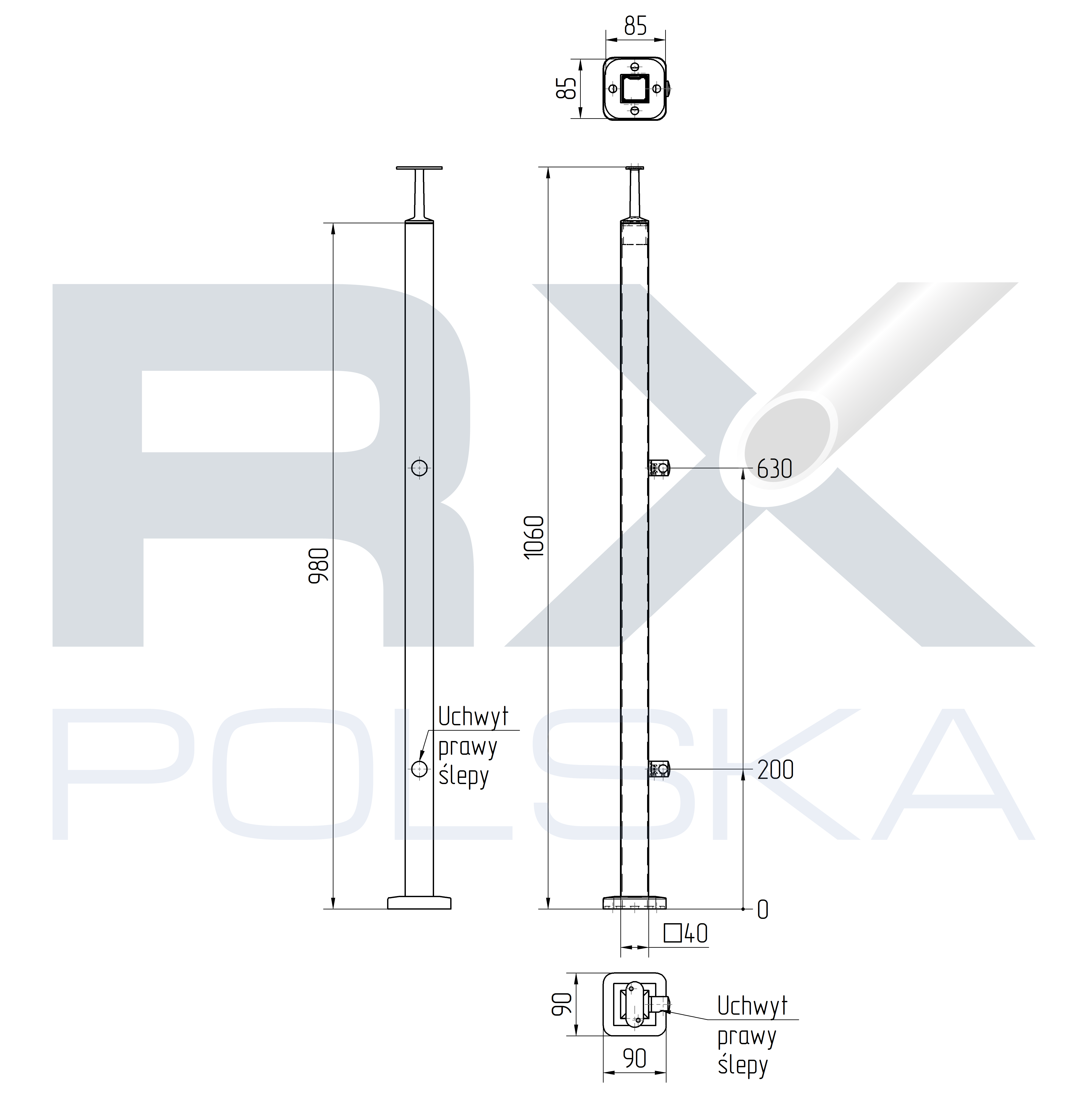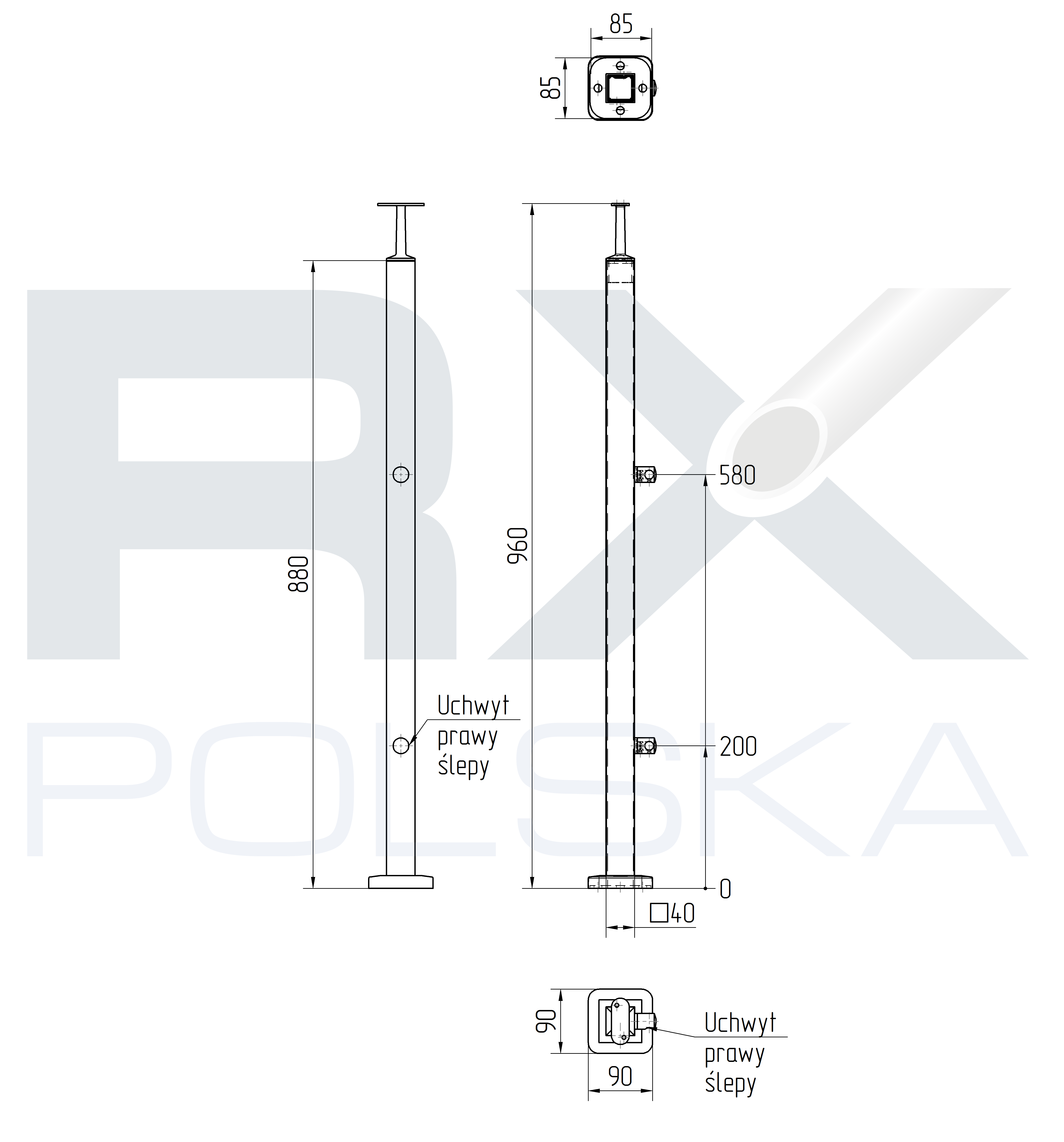 Столбик ПРАВЫЙ 40x40мм с 2 ригелями на трубу 12мм, AISI 304, ШЛИФ