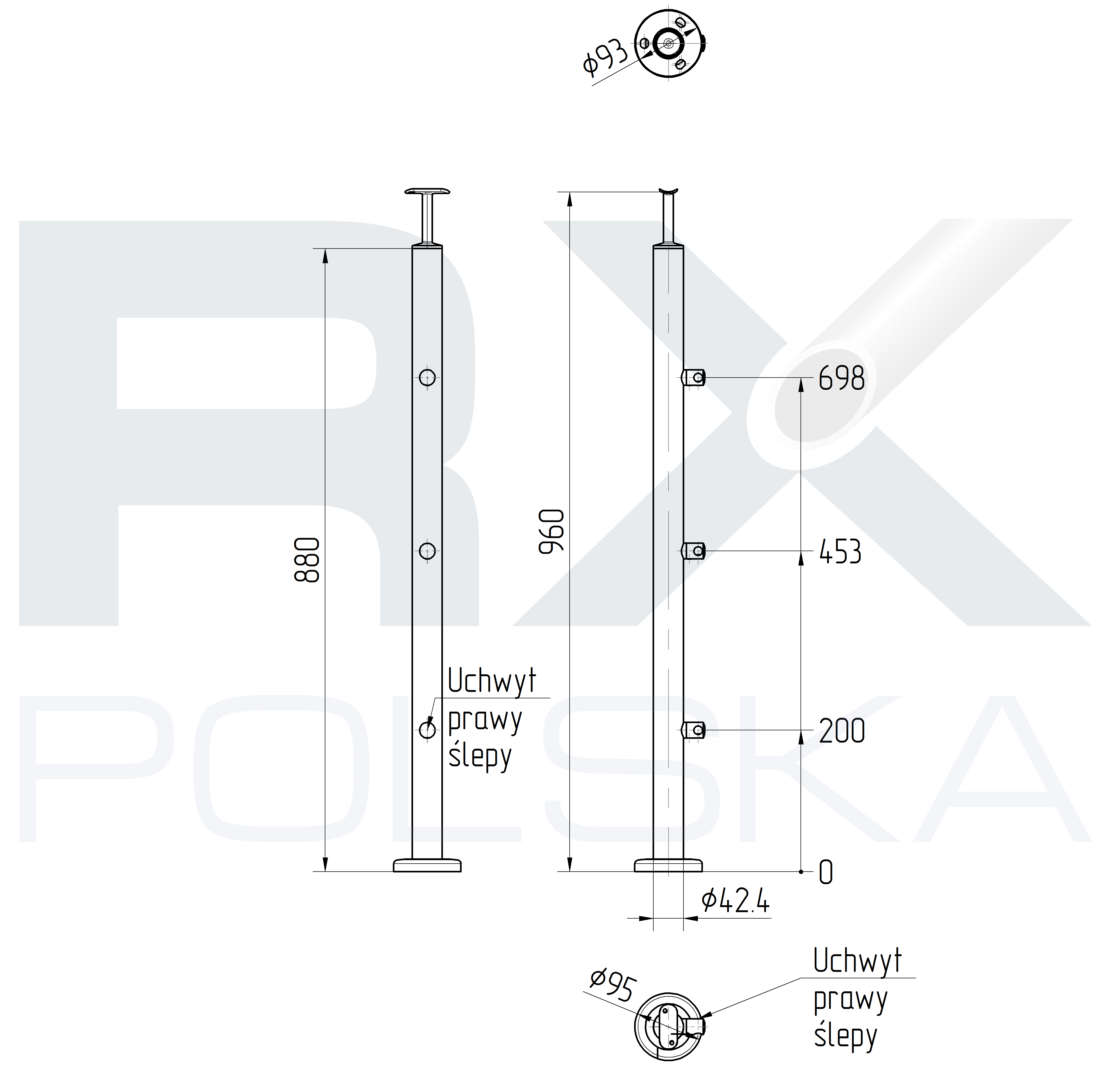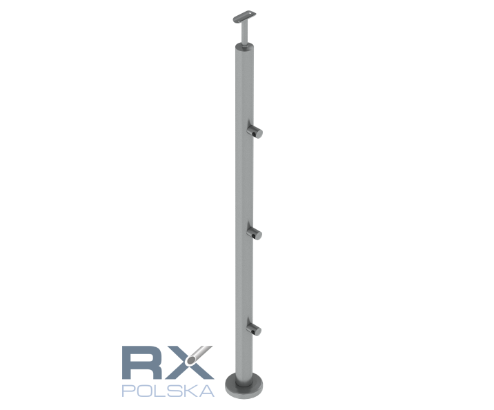 Столбик ПРАВЫЙ 42,4мм с 3 ригелями на трубу 12мм, AISI 304, ПОЛИР