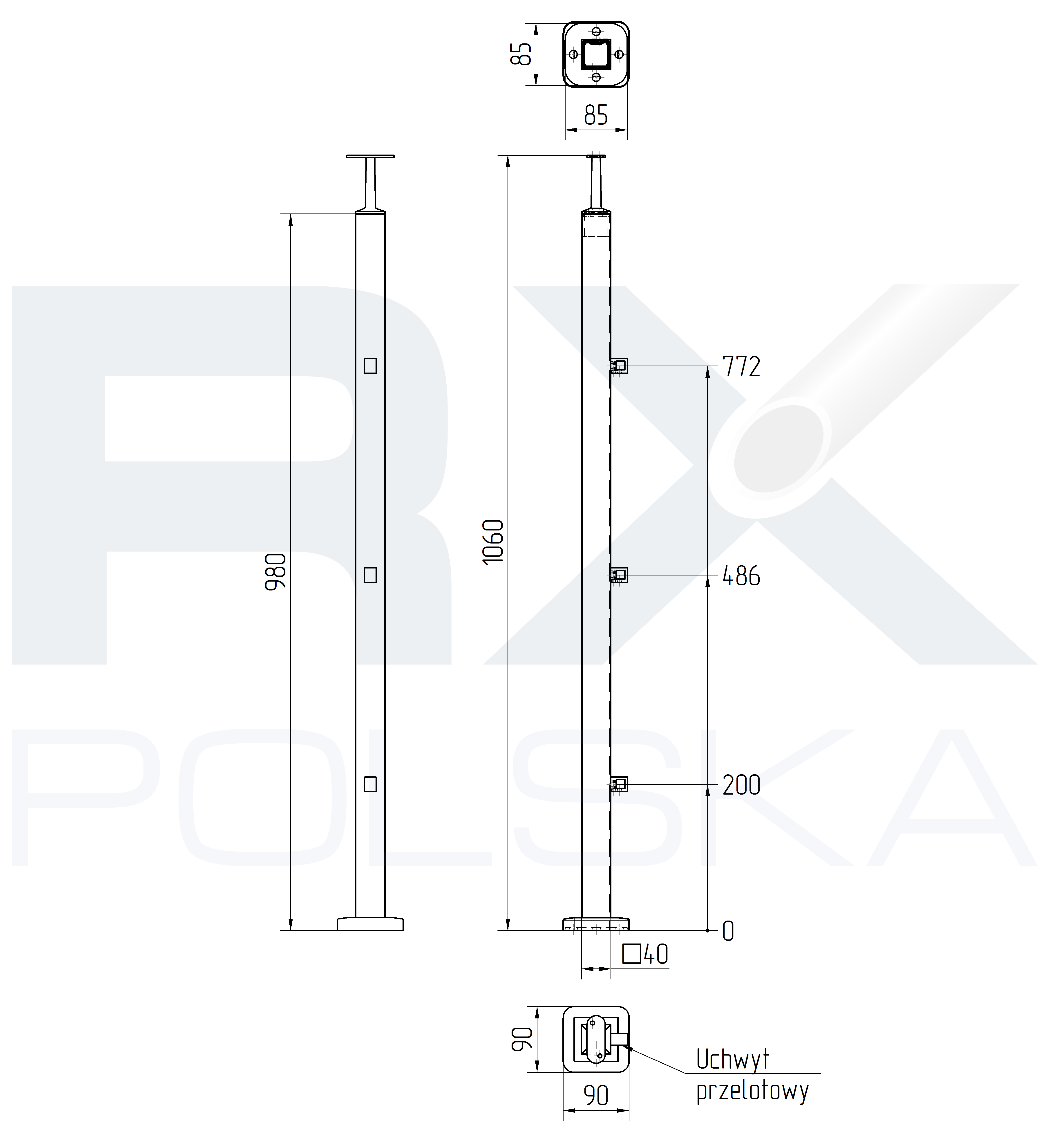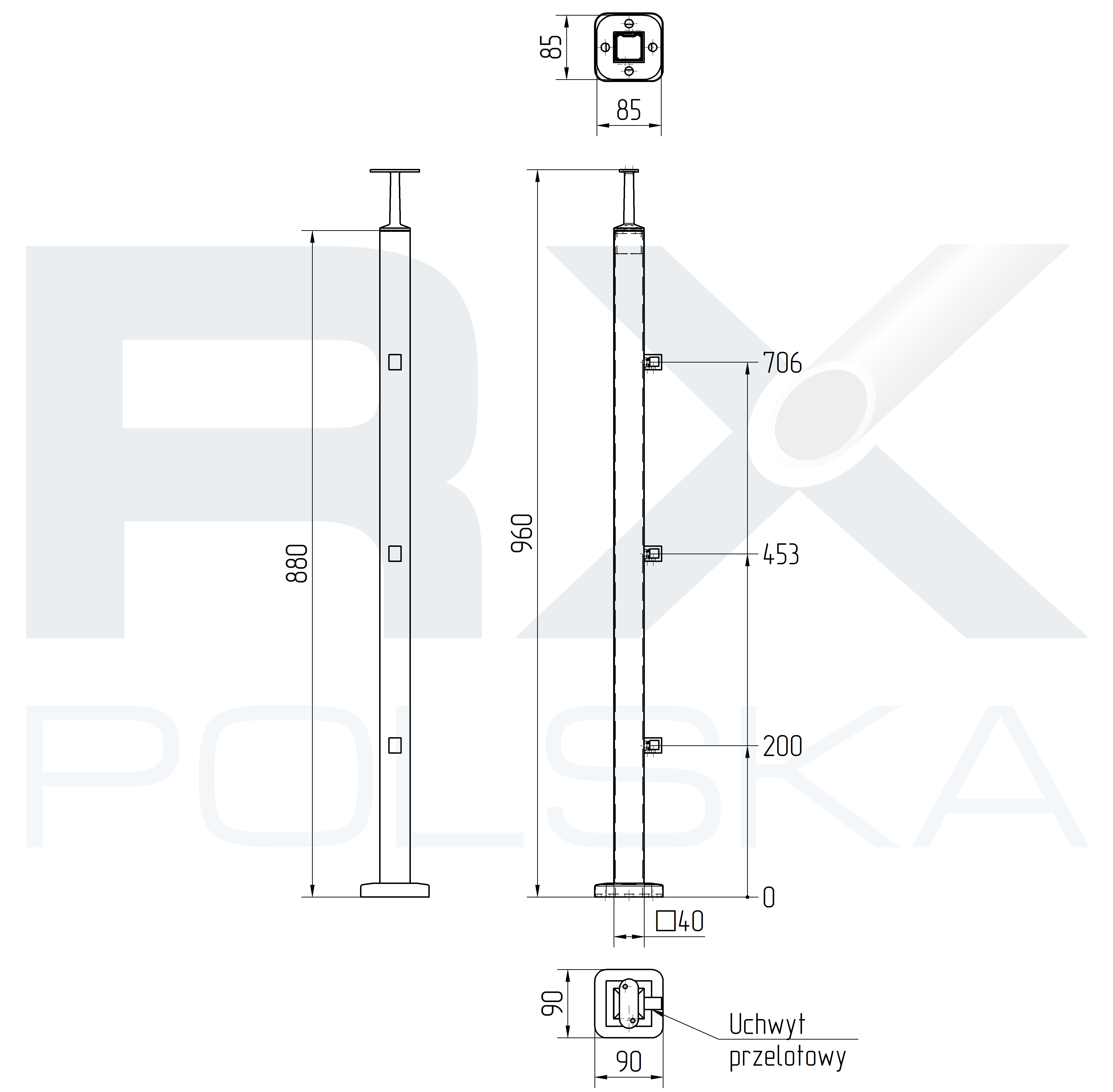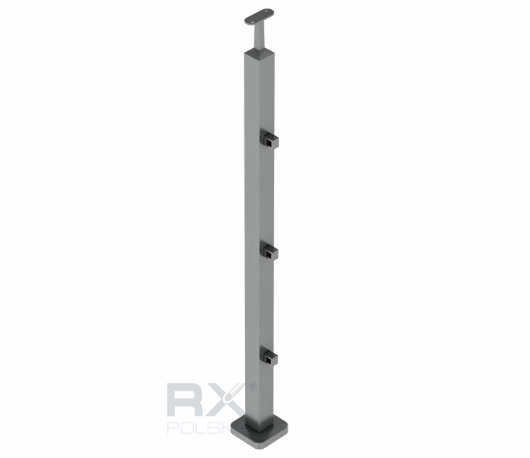 Столбик 40x40мм с 3 ригелями на профиль 10мм, AISI 304, ШЛИФ