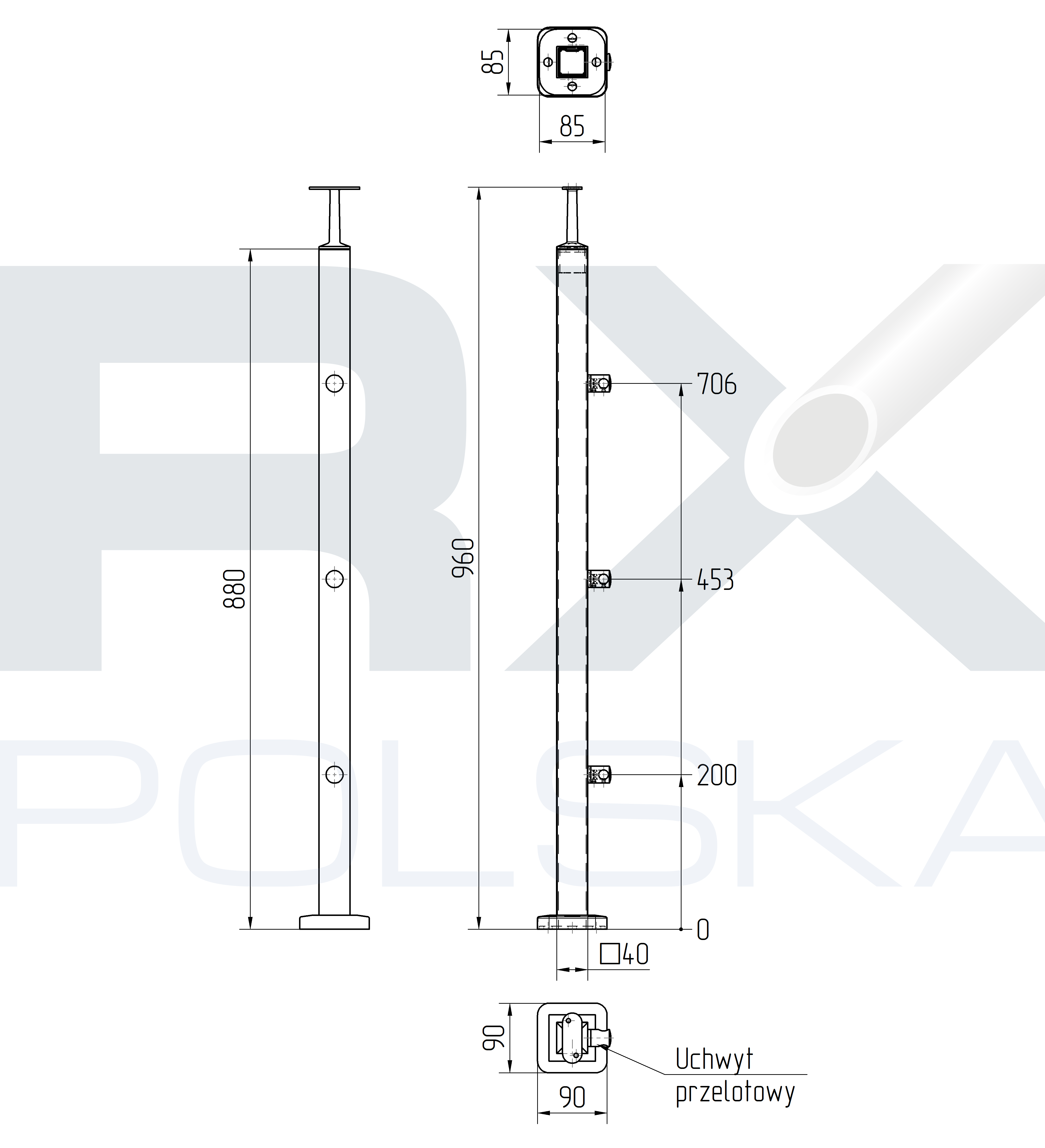 Столбик 40x40мм с 3 ригелями на трубу 16мм, AISI 304, ШЛИФ