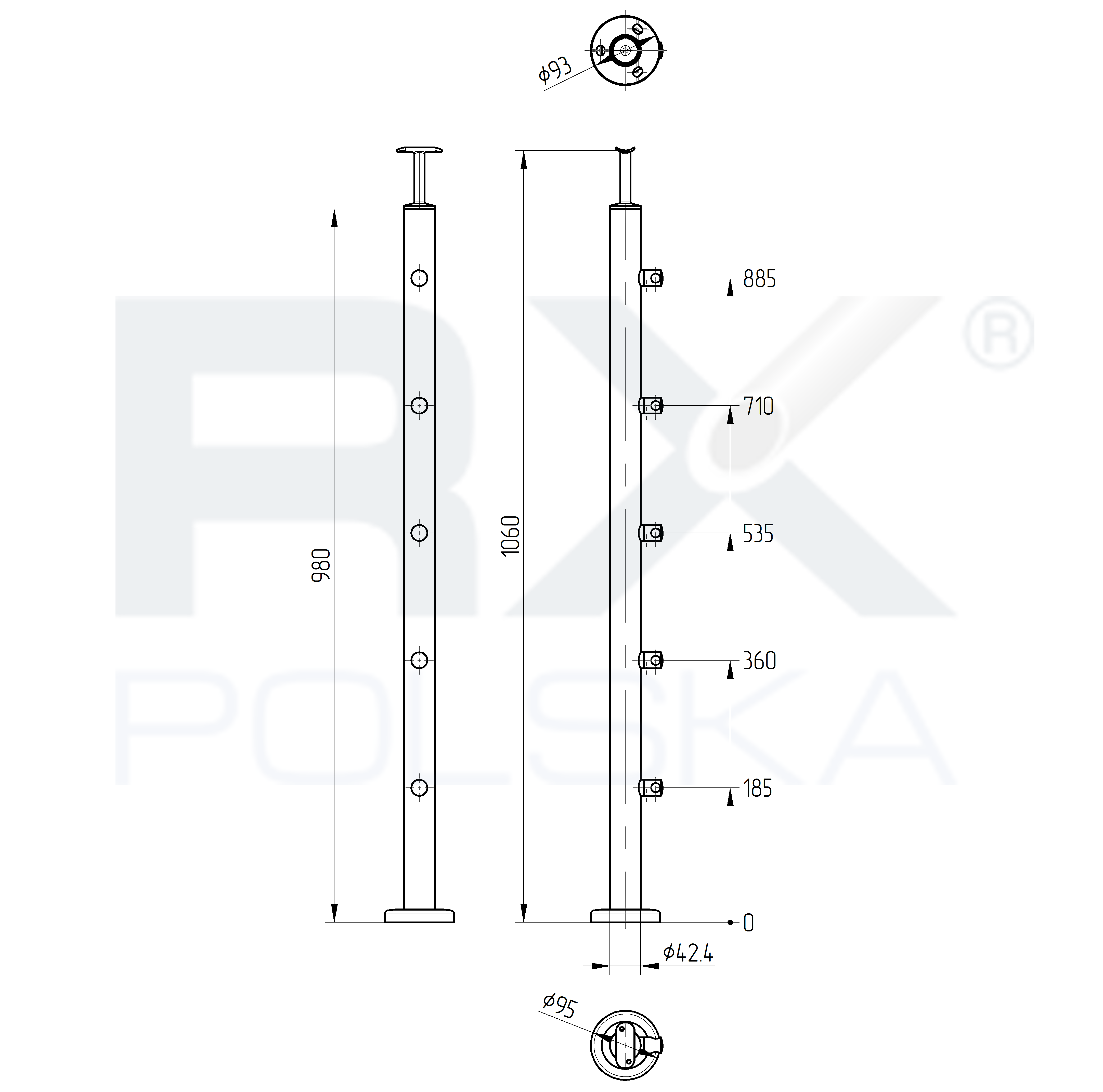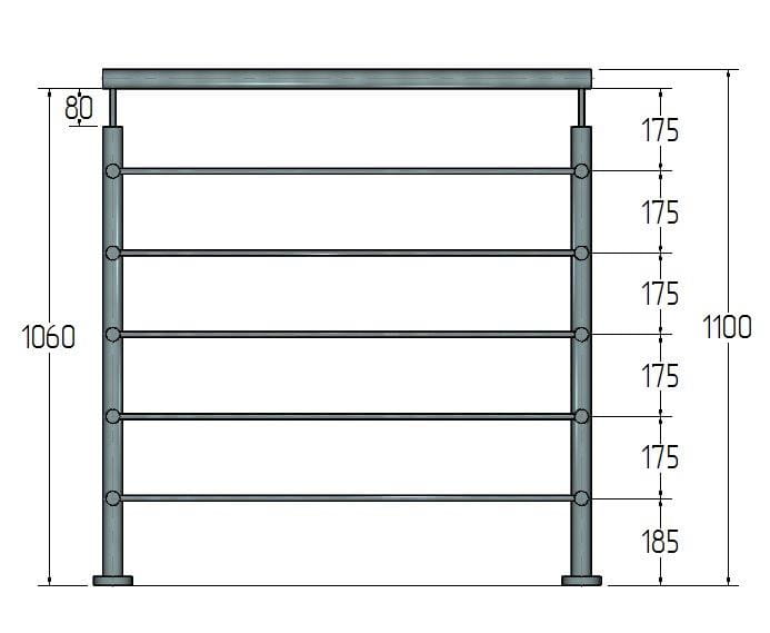 Столбик 42,4мм с 5 ригелями на трубу 12мм, AISI 316, ШЛИФ
