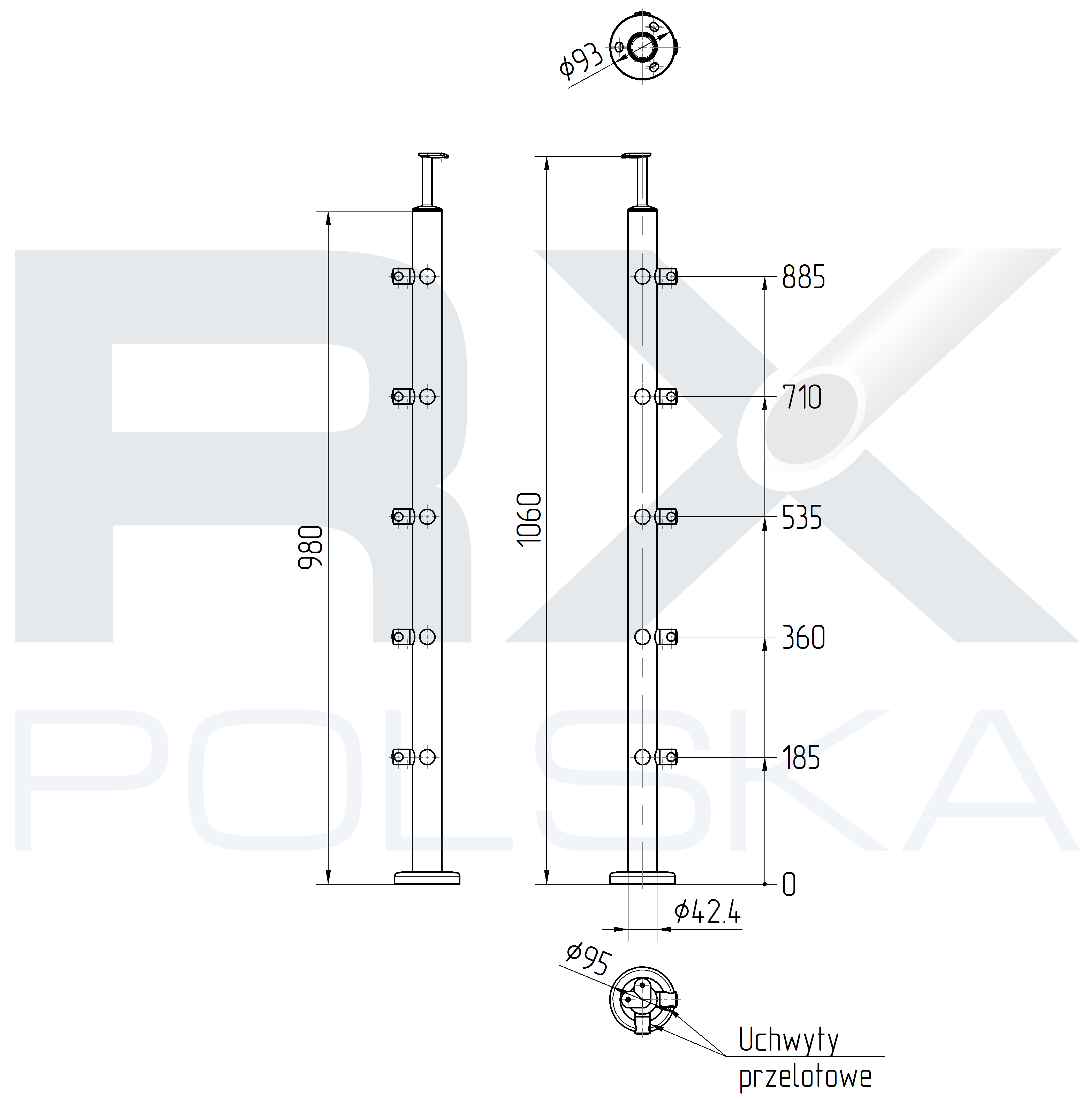 Столбик 42,4мм угловой с 5 ригелями на трубу 16мм, AISI 316, ШЛИФ