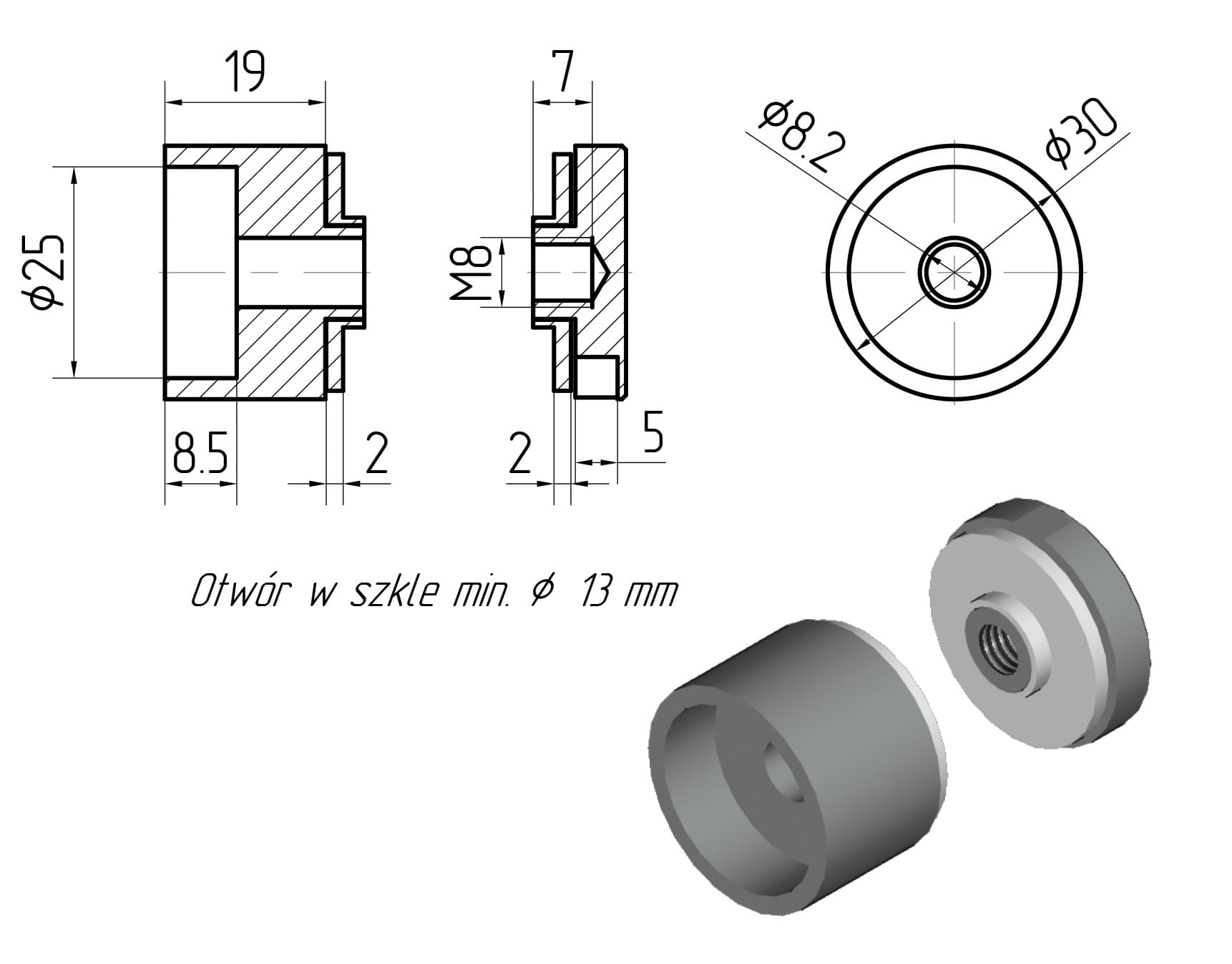 • Минимальное монтажное отверстие в стекле - 13 мм