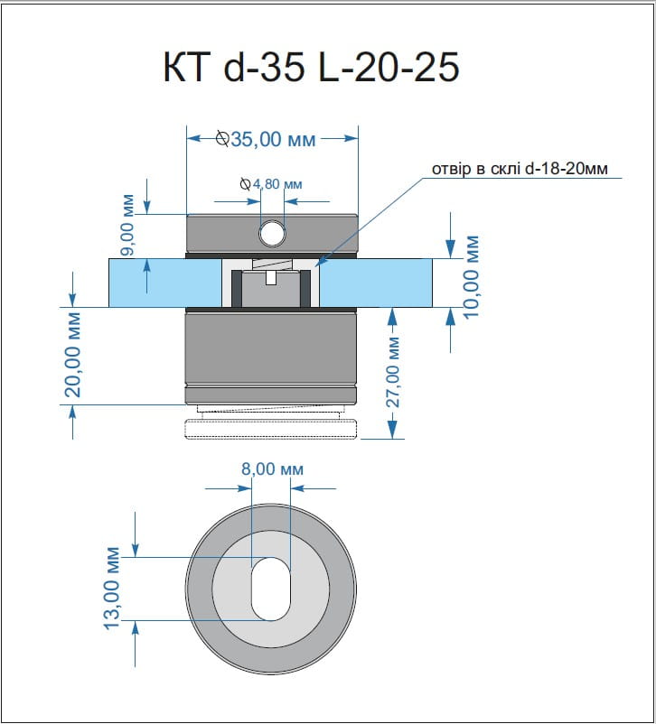 - Минимальное монтажное отверстие в стекле - 14 мм