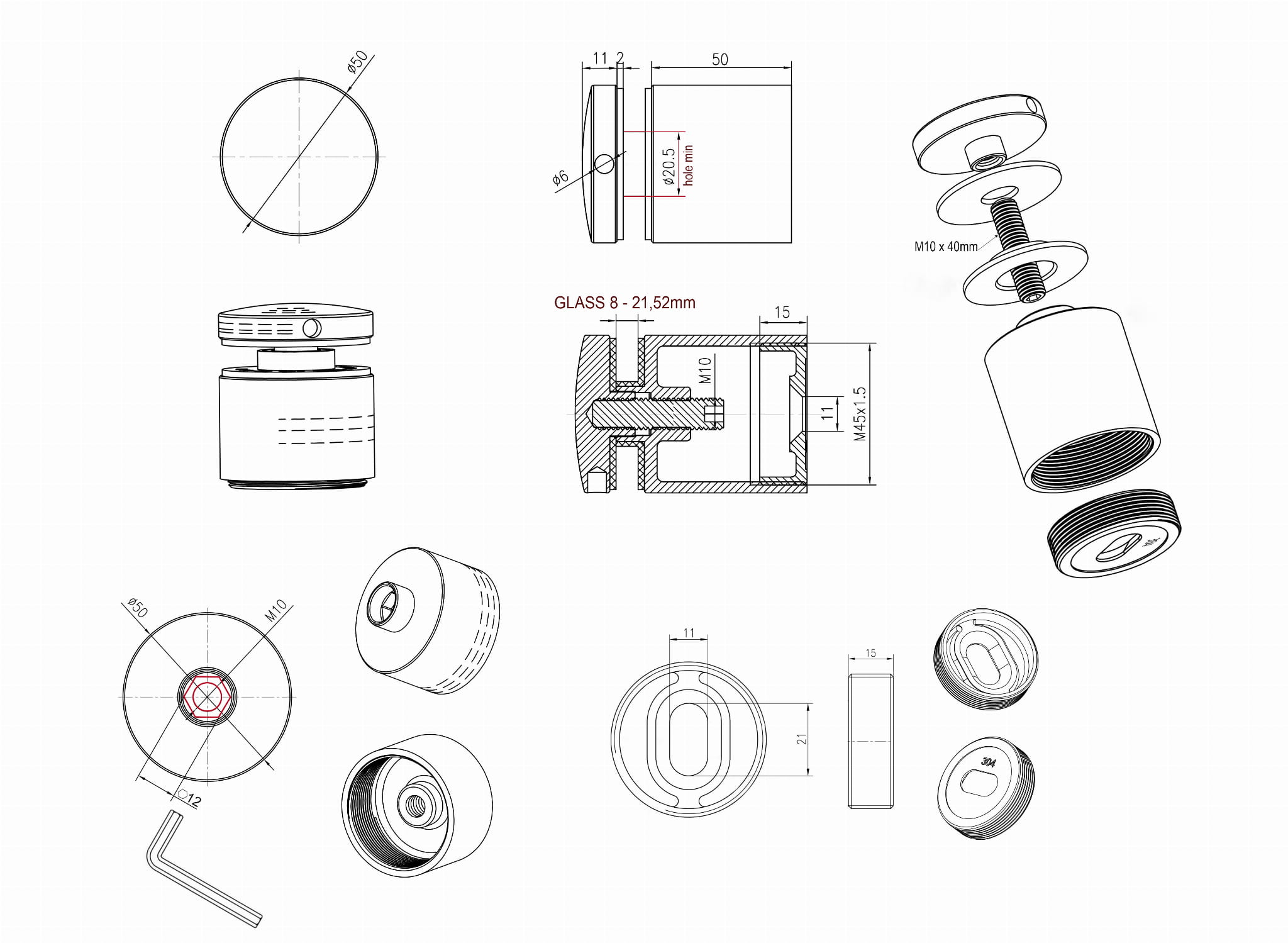 - Минимальное монтажное отверстие в стекле - диаметр 20мм