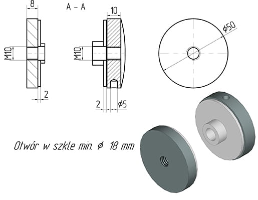 Точечный стеклодержатель ø50мм к плоской поверхности, М10, AISI 304, ШЛИФ