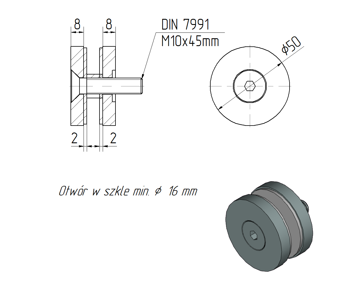 • Сборка - Винт DIN 7991 M10x45 мм в комплекте - может быть изменен на другую длину (спросите продавца)