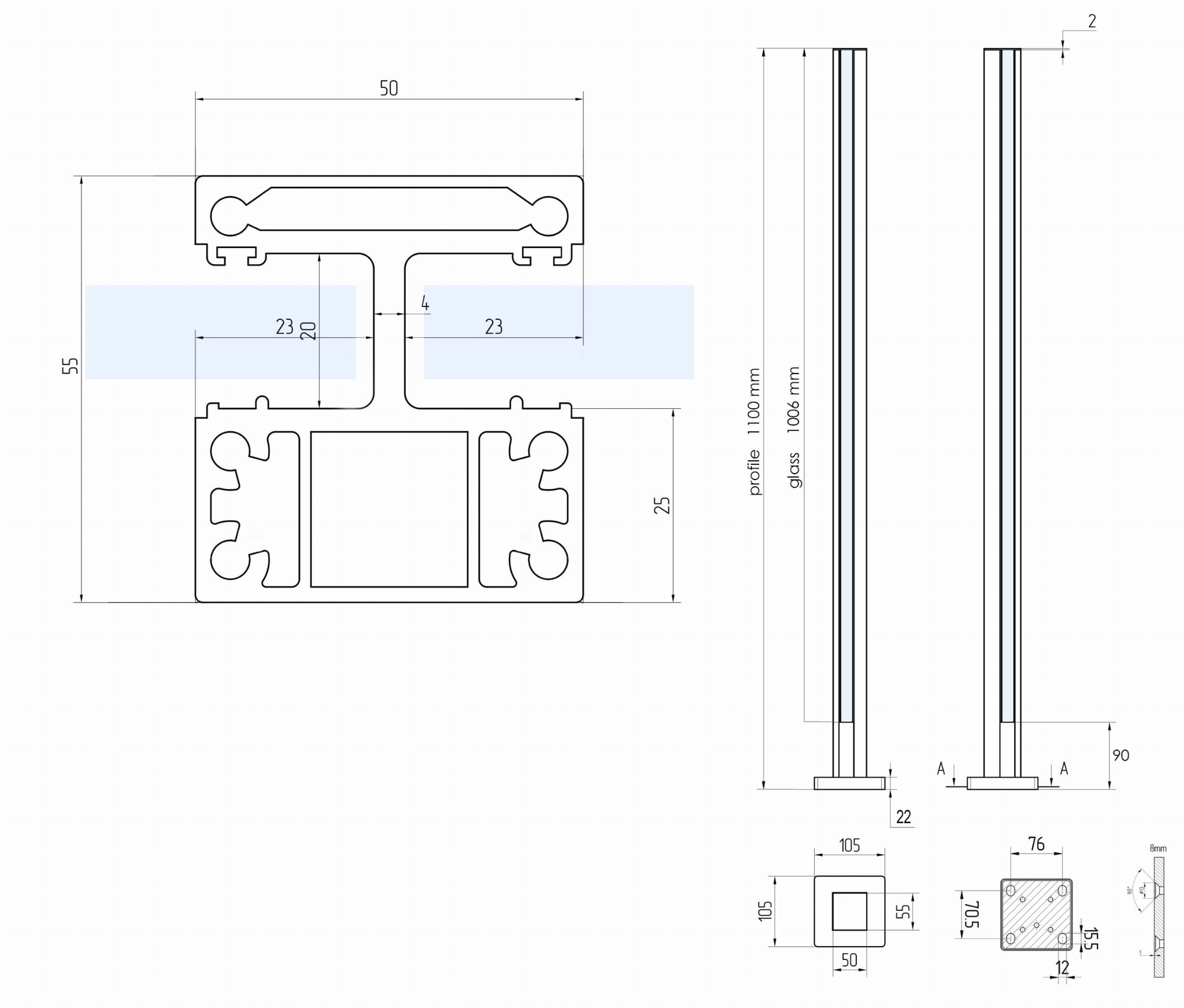 - Стойка (профиль + основание (толщина 8 мм), скрепленное винтами) + верхняя крышка (толщина 2 мм)