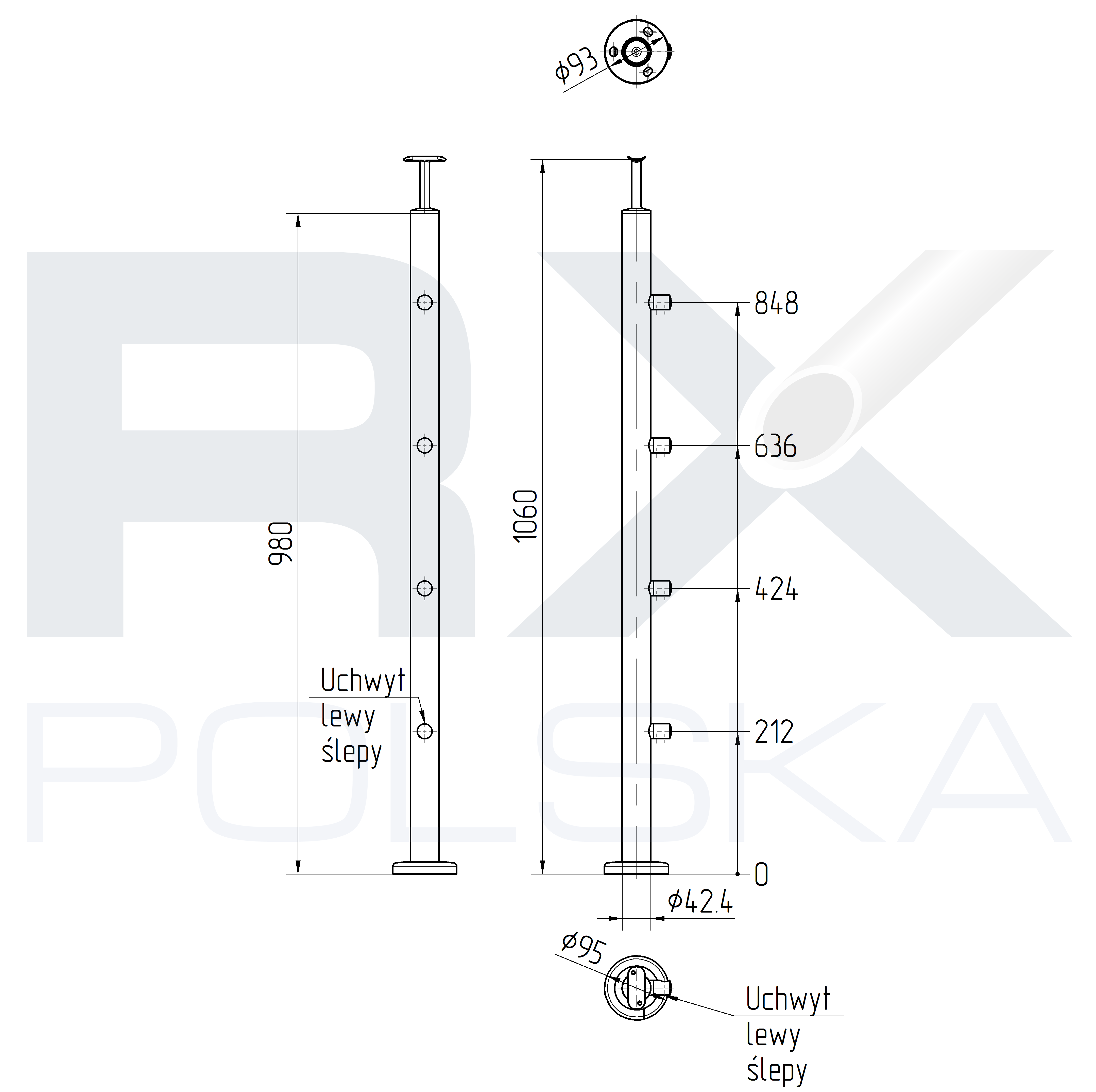 Стовпчик ЛІВИЙ 42,4мм з 4 ригелями на трубу 12мм, AISI 304, ШЛІФ
